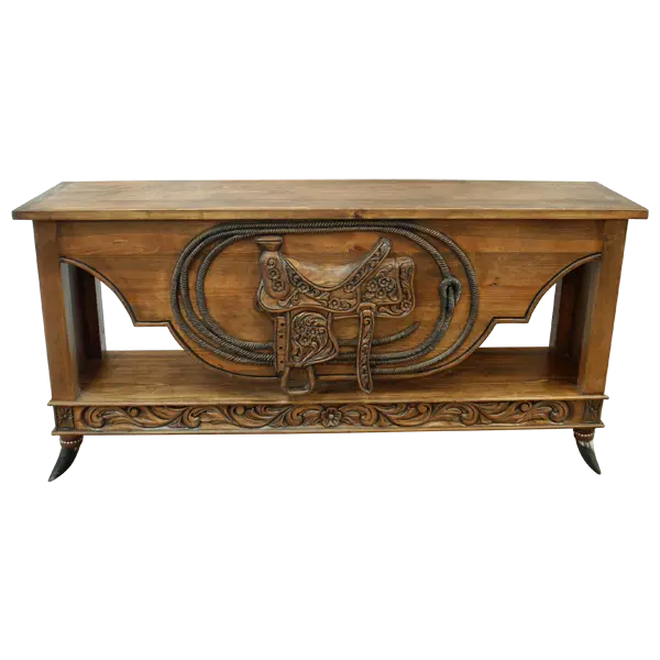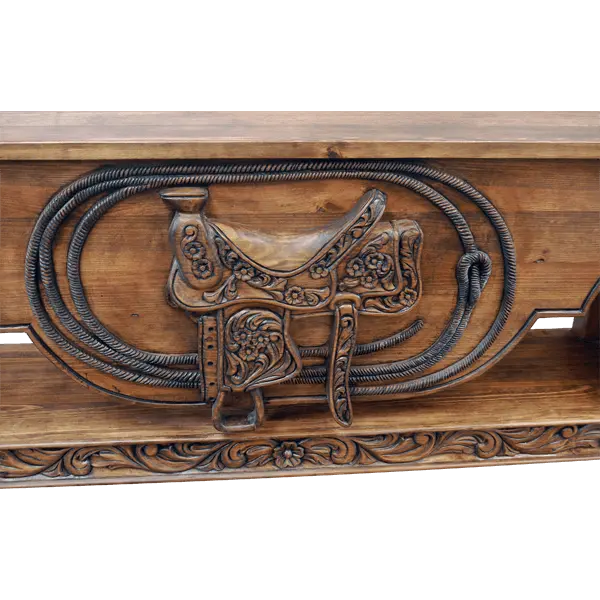 This handcrafted, Western style console features a solid wood, geometric cut apron and is magnificently adorned with a hand carved saddle as the central focal point. Surrounding the saddle is an incredibly realistic, fully carved lasso, detailed with remarkable depth, texture, and dimension. Each panel on the lateral sides showcases decorative hand carved floral motifs, adding additional heirloom richness to this collectible-level console.