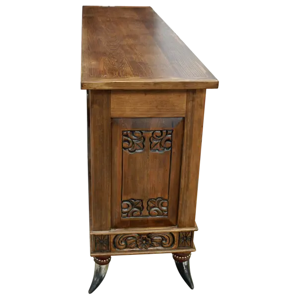 The console is built with a large open top surface with a classic straight rim, reinforced base carving, and it rests proudly on inverted steer horn legs — making this a statement piece that is impossible to ignore. Finished in a warm, light antique stain, crafted from sustainable, solid wood, and 100% fully customizable in size, finish and detailing.