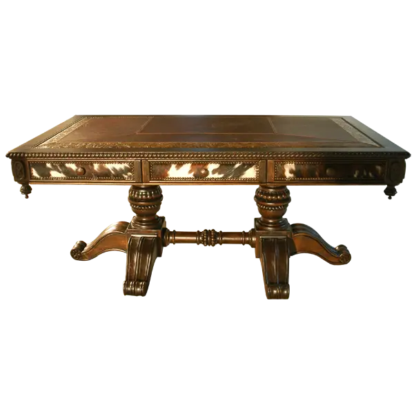 The expansive tabletop showcases an inner leather inlay of rich full-grain hide, framed by a contrasting patterned leather border—each section double-stitched for enduring strength and precision. The edges gleam with ornate gilt nails and are finished with a rope-carved molding, a hallmark of fine Western design.
