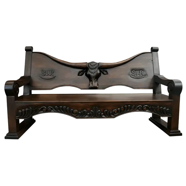 The curved solid wood backrest showcases a striking hand-carved longhorn bull head, rendered in remarkable detail. The wide horns extend gracefully toward the scrolled uprights, creating a powerful silhouette that commands attention. On each side, custom hand-carved ranch brands bring a personal touch — whether you wish to feature your initials, logo, or a unique symbol of your legacy.