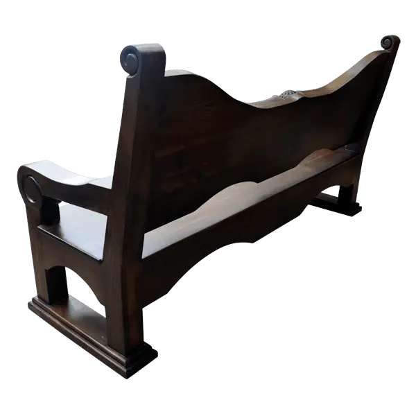 Flowing below, the front apron is adorned with intricate floral and scroll carvings, each detail chiseled by hand to achieve depth and movement. The sturdy rectangular legs and scroll-arm supports complete the look with classic Western stability and form.