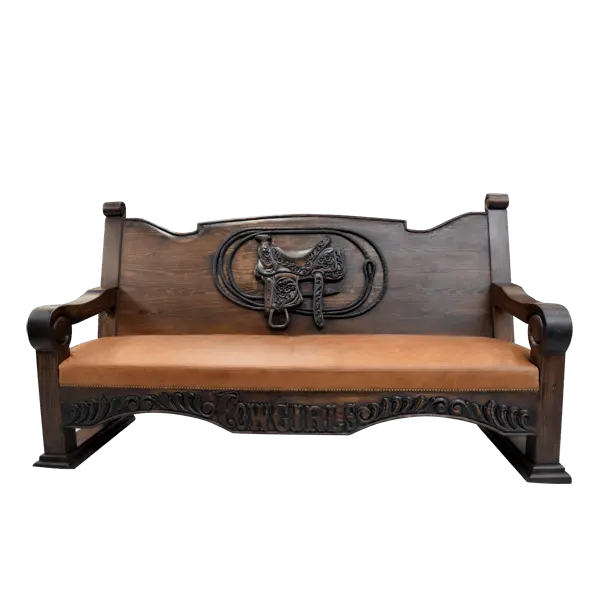 The curved backrest is masterfully adorned with a hand-carved Western saddle, surrounded by an exquisitely detailed lasso—each strand and contour sculpted with remarkable realism. These intricate carvings bring the essence of ranch life into your space, embodying both motion and authenticity.