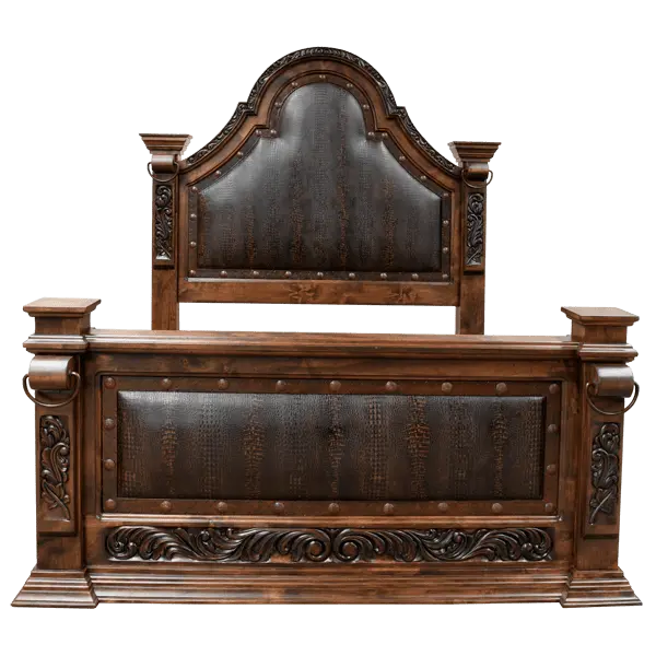 Intricate scroll carvings embellish the lower panels and bedposts, while hand-carved floral accents bring an air of Old World refinement. Substantial square columns anchor each corner, complete with traditional molding and wrought-iron ring pulls—a subtle nod to classic Western design.