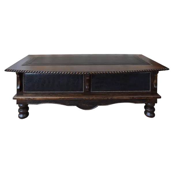A twisted rope edge molding frames the top, adding sculptural dimension and reinforcing the craftsmanship found throughout the piece. Below, turned pedestal legs lend substance and balance, anchoring the design with classic Western weight and poise.