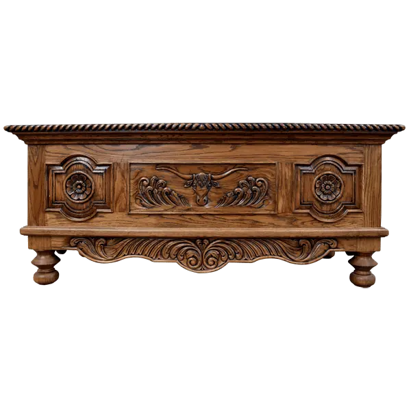 The front of the desk showcases a bold longhorn steer head, masterfully hand-carved into the center panel and flanked by ornate floral medallions and scrollwork motifs. Each lateral side mirrors this artistry, featuring geometric carvings that highlight the natural grain and warmth of the hardwood.