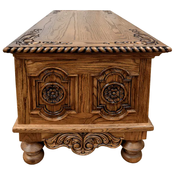 A decorative apron beneath the front and side bases features flowing, hand-carved floral and scroll designs, complemented by turned bun-style legs that ground the piece with traditional Western poise.