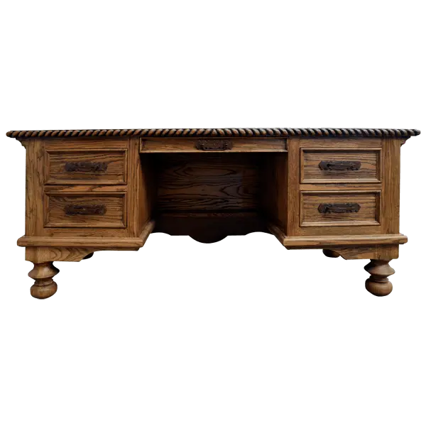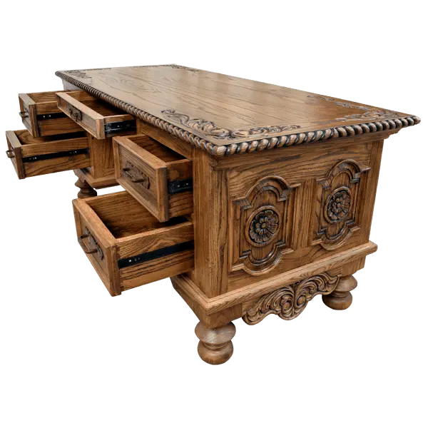 The desktop is framed with exquisite carved borders and a rope-edge molding, demonstrating the remarkable attention to detail that defines every inch of this piece. Its broad surface provides ample space for daily work or display, while the array of drawers on each side adds both beauty and utility. Each drawer is fitted with hand-forged iron handles and built for long-lasting strength, offering generous storage for writing instruments, documents, and essentials.