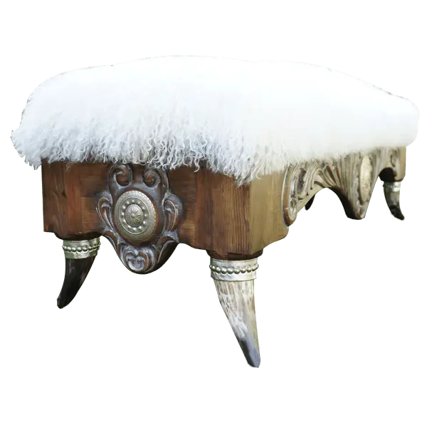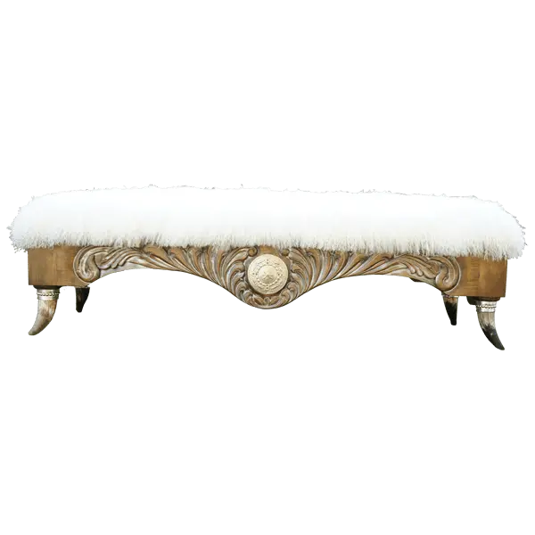 The plush seat, designed without a back, is upholstered in magnificent Tibetan wool, offering a soft, cloud-like texture that contrasts beautifully with the bench’s sculptural woodwork. Along the curved Spanish Colonial-style apron, elaborate hand-carved floral motifs shimmer under an antique silver finish, showcasing a harmony of artistry and refinement.