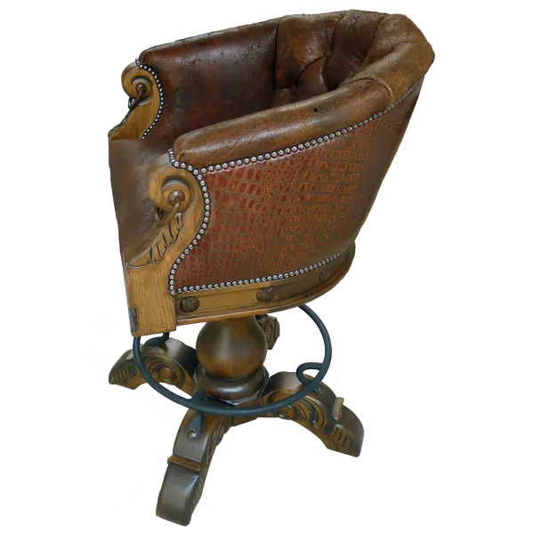 The solid wood frame is finished in warm, rustic tones and accented with hand-carved scrollwork on the armrests. Hand-forged iron conchos and decorative iron rings add a bold, authentic Western touch. Resting on a turned wooden pedestal with four carved feet, joined by a forged circular footrest, this stool is built for both durability and beauty. The 180° swivel seat ensures comfort and practicality without compromising its heirloom appeal. Fully customizable to fit your personal style and setting.