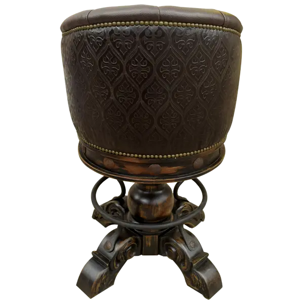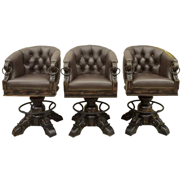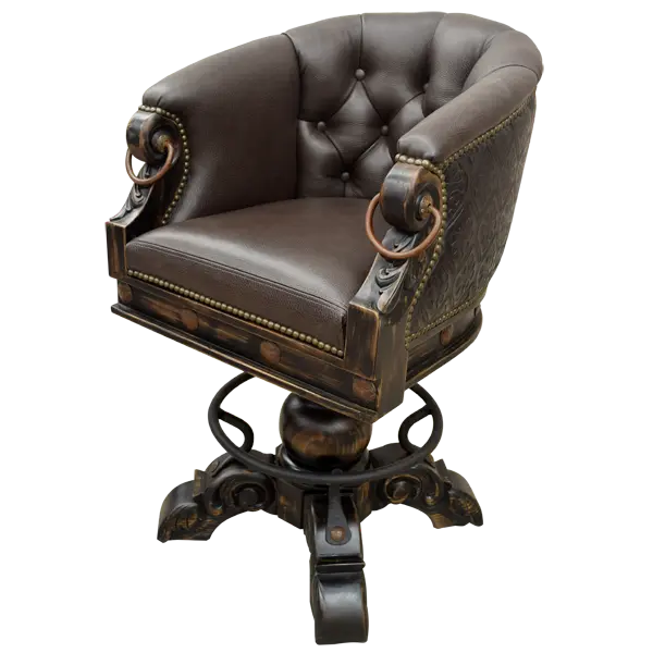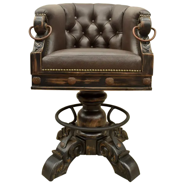 The hand-carved wooden frame features ornate leaf motifs, complemented by forged iron conchos and decorative iron rings at the armrests—hallmarks of the Colonial aesthetic. The turned trumpet pedestal and four carved feet are joined by a forged circular footrest, ensuring strength, balance, and comfort. With a smooth 180° swivel, this barstool offers both luxury and functionality. Fully customizable to suit your desired look and finish.