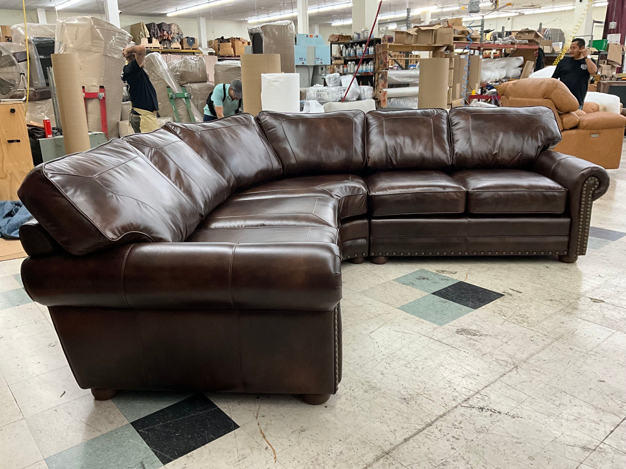 Brand new Laramie Sectional Sofa that was cancelled by customer post production. Left arm loveseat + pie + right arm loveseat configuration with Relic Toast base leather and antique brass nailhead trim.