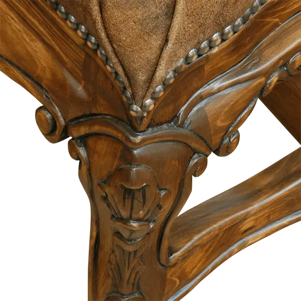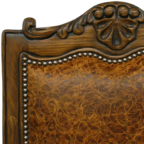 The seat is upholstered in sumptuous distressed full-grain leather, chosen for its rich patina and supple texture that deepens with age. The seat back showcases a hand-tooled, embossed leather panel with intricate scrollwork and warm, amber undertones — a tribute to traditional Western craftsmanship. Each section of upholstery is individually hand-tacked with precision to the solid wood frame, reflecting the dedication of our skilled artisans.