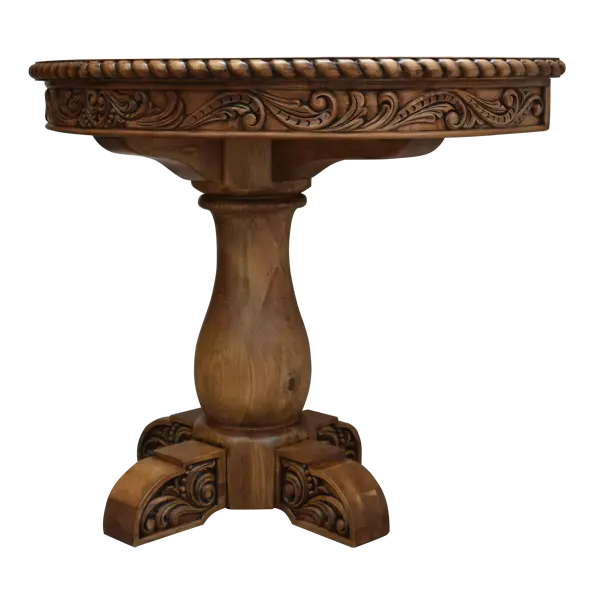 Supporting the top is a hand-turned pedestal base, sculpted from a single piece of solid wood. The pedestal stands on four robust feet, each one beautifully carved with ornate floral accents that mirror the apron’s design.